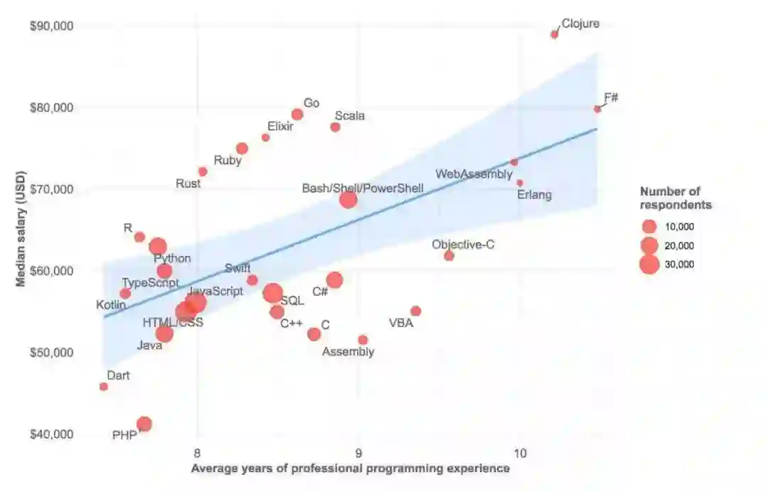 不难看出,使用 Clojure、F#、Scala、Go、Rust 和 R 语言的开发人员,虽然工作经验并不见得非常多,尤其是 Rust、R、Ruby 和 Go,也会获得不少的薪水。然而,PHP、Java、C、C++,即使有多年开发经验,薪水也很难有比较高的提升。