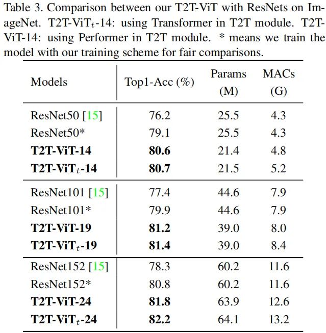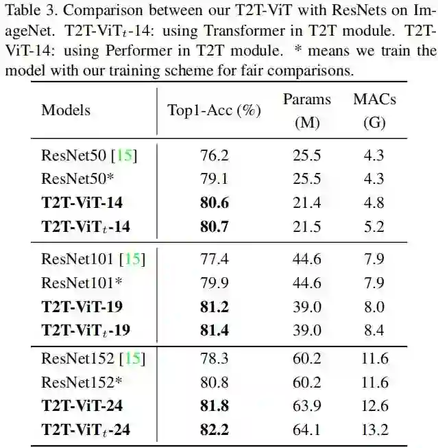 相比标准ViT,所提T2T-ViT的参数量与MACs可以减低200%,并取得2.5%的性能提升(注仅用ImageNet从头开始训练);所提T2T-ViT同样取得了优于ResNet的性能,比如,在ImageNet数据集上,T2T-ViT-ResNet50取得了80.7%的Top1精度。可参考下图。