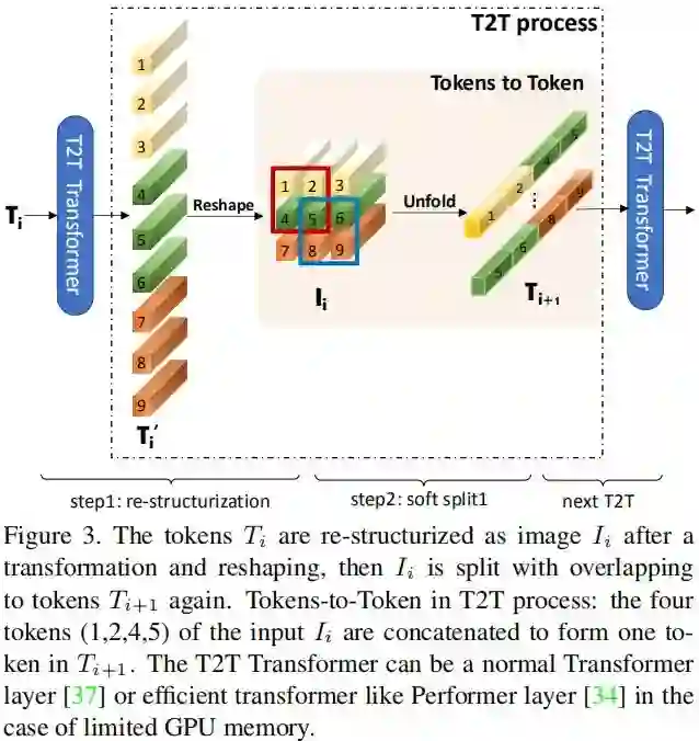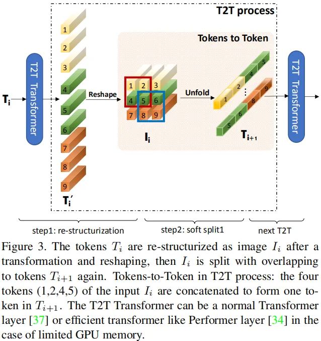注:每个拆分块尺寸为 。最后将所有块在空域维度上flatten为Token 。这里所得到的输出Token将被送入到下一个T2T处理过程。
