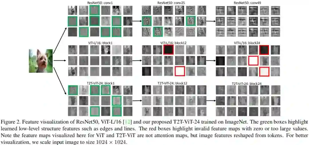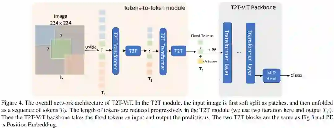 为克服上述局限性,作者提出了一种新的Tokens-to-Token Vision Transformer,T2T-ViT,它引入了(1) 层级Tokens-to-Token变换通过递归的集成近邻Tokens为Token将渐进的将图像结构化为tokens,因此局部结构可以更好的建模且tokens长度可以进一步降低;(2) 受CNN架构设计启发,设计一种高效的deep-narrow的骨干结构用于ViT。