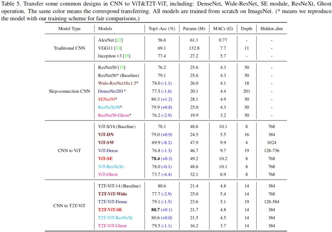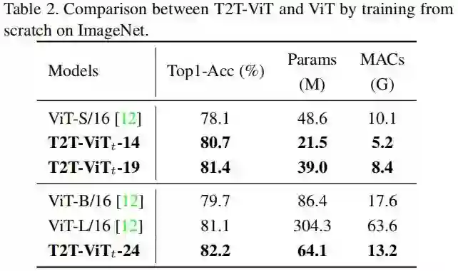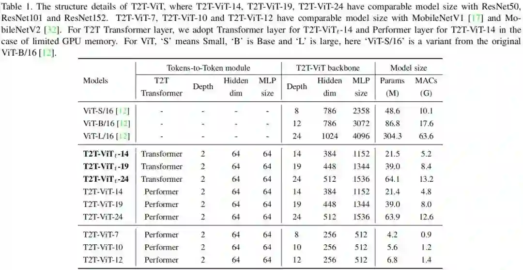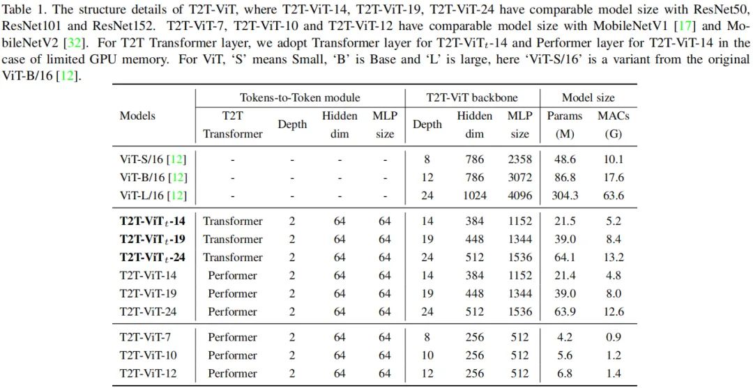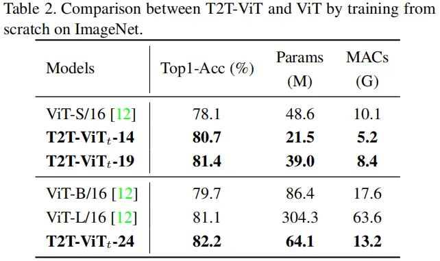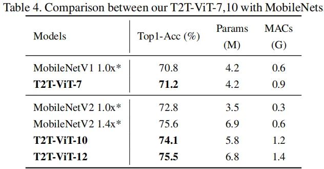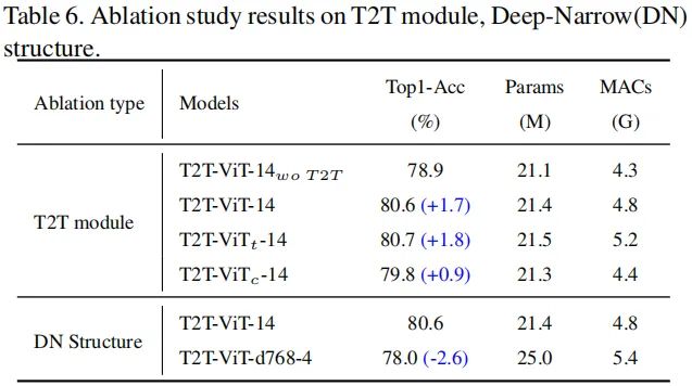 另外,由于T2T模块中的Token长度要比常规形式的更大,故而MAC与内存占用会非常大。为克服该局限性,在T2T模块中,作者设置通道维度为32(或者64)以降低MACs。