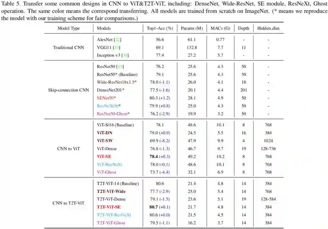 最后还给出了不同CNN结构设计思想在T2T-ViT的性能对比,见下表。