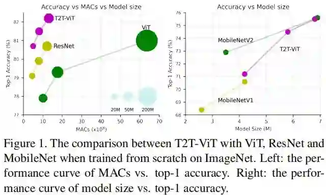 本文是依图科技在ViT方面的一次突破性的探索。与之前ViT、Detr、Deit等不同之处在于:本文针对ViT的特征多样性、结构化设计等进行了更深入的思考,提出了一种新颖的Tokens-to-Token机制,用于同时建模图像的局部结构信息与全局相关性,同时还借鉴了CNN架构设计思想引导ViT的骨干设计。最终,仅仅依赖于ImageNet数据,而无需JFT-300M预训练,所提方案即可取得全面超越ResNet的性能,且参数量与计算量显著降低;与此同时,在轻量化方面,所提方法只需简单减少深度与隐含层维度即可取得优于精心设计的MobileNet系列方案的性能。强烈推荐各位同学研究一下该文。