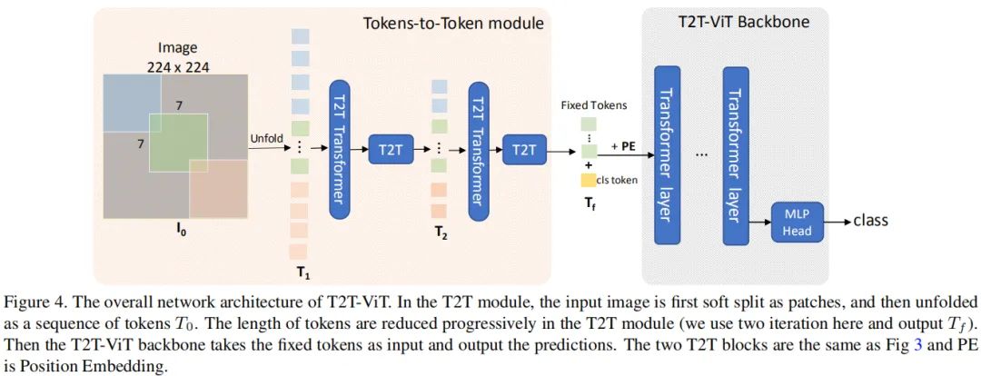 通过交替执行上述Re-structurization与Soft Split操作,T2T模块可以逐渐的减少Token的长度、变换图像的空间结构。T2T模块可以表示为如下形式: