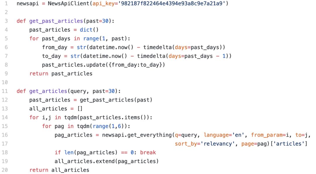 首先需要收集数据。我们可以用任何形式的文本,只要这些文字的内容可通过时间线表示。本文选用 newsapi,从该数据源获取数据很容易,其开发者计划每天可获取500个免费请求。以下是处理请求的代码: