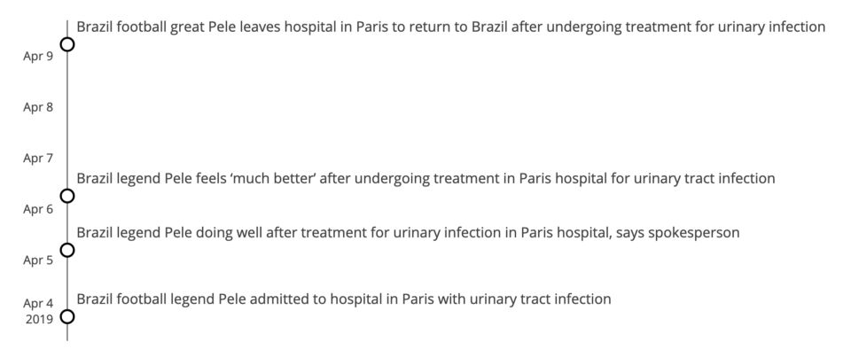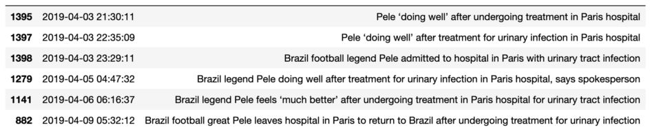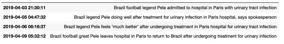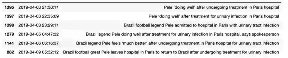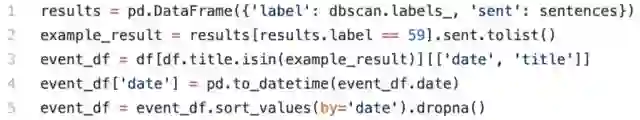 对于每个分类我们得到如上形式的data frame。接下来是以时间线排列这些句子,并过滤掉相似的句子。每天只呈现一篇文章,这样实现出来的时间线就干净而统一。