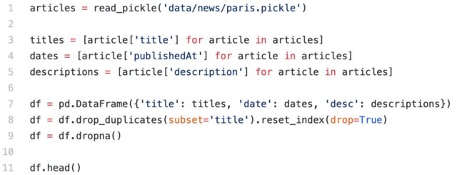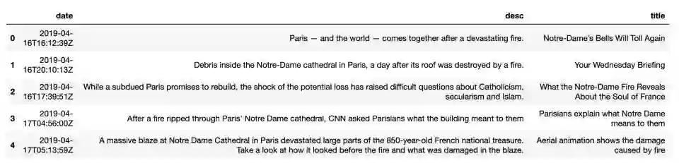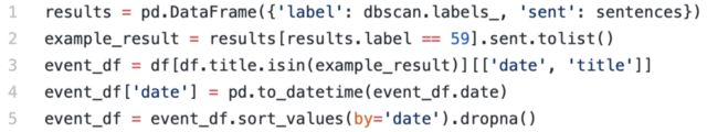 最后一个函数,返回特定查询的结果列表,大约包含2000篇文章。我们的目的是抽取这些文章总的事件。为简化这一过程,只保留文章标题 (理论上,标题应该蕴涵新闻的核心内容)。