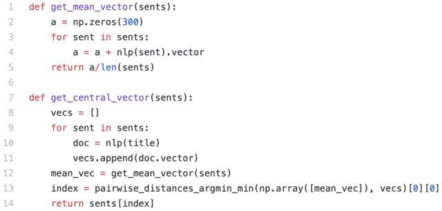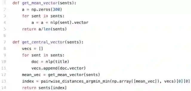 按天聚类句子,在每个组中选择其最靠近中心的句子。以下是从一组向量中找出中心向量的函数: