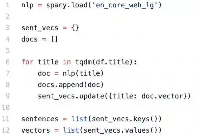 前面拿到了文章的标题,现在需要将其转换为算法能理解的形式。注,本文跳过了整个文本预处理环节,因为与本文不太相关。不过,如果你是新手,应用模型前务必作预处理 → 请打开原文查看一篇很好的教程。