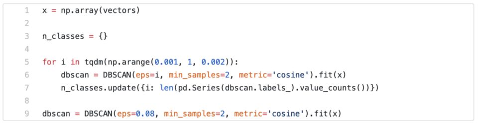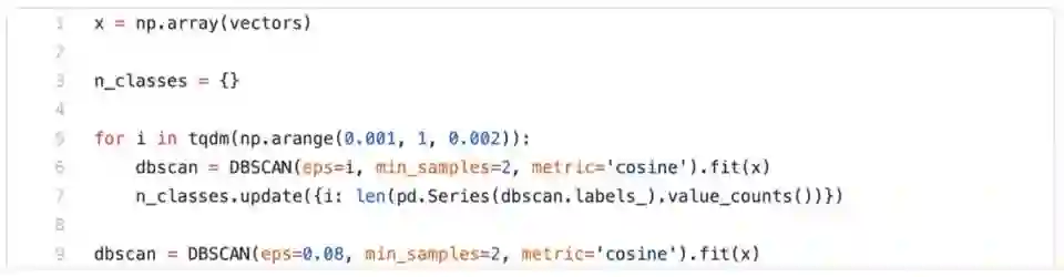 给 eps 调参是最为精巧的一步,因为聚类的结果会改变很多,也就是如何确定句子是相似的。通过试验找到恰当的值,能保持句子间的相似度,同时不把相近的句子分到不同组去。