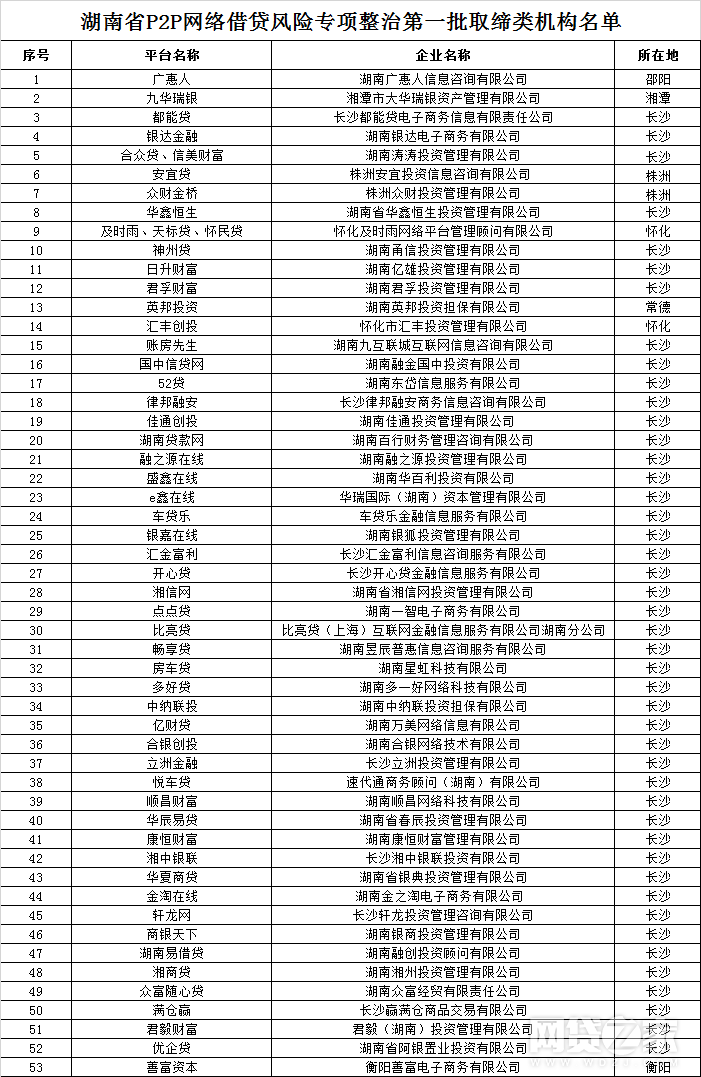 据网贷之家此前报道,2018年11月, 湖南金融局官网发布公告称,湖南省P2P网络借贷风险专项整治第一批取缔类机构名单已经确定,共包括P2P网贷机构53家(名单如下表所示)。