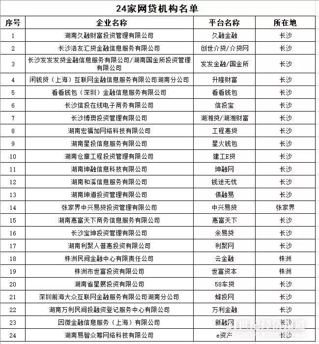 24家网贷机构大部分位于长沙市,包括久融金融、创世介贷/介贷网、发发金融/国金所、升隆财富、看看钱包、信投宝、湖湘贷/湖湘财富、工程惠贷、星火钱包、建工E贷、坤融网、钱途无忧、债融易、中兴易贷、惠富天下、余易贷、利聚网、云金融、世富资本、58车贷、蜂投网、万利金融、新融网、e资产。