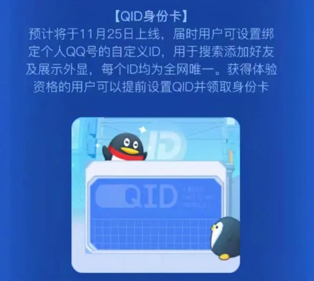 11 月 19 日消息 据悉,目前 QQ 正在内测 QID 功能,该功能可以让用户创建一个开头字母后面数字的 7-10 位的 ID。据悉,QQ 预计会在 11 月 25 日上线 QID 功能,和微信号的作用一样,用户可以自定义 QQ 的 ID,且 QID 必须为字母加数字,SVIP 可设置 7-10 位,普通用户 8-10 位,可以用于添加好友和外显,首批体验用户 7 万个,SVIP9 可抢先体验。