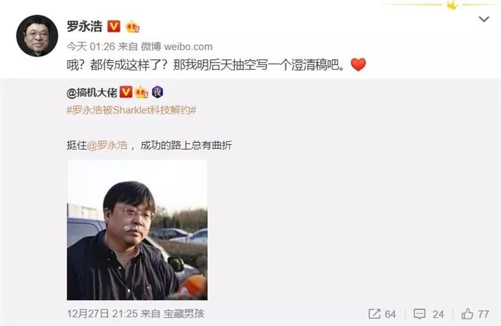 罗永浩回应“被Sharklet科技解约”:明后天抽空写一个澄清稿