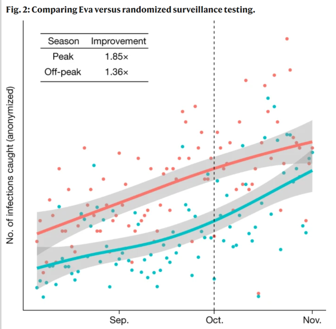 借助 Eva,希腊每天对抵达或途经该国的估计 41,830 户家庭中的约 17% 进行检测。通过将 Eva 的性能与模拟情景进行比较,研究发现,Eva 发现的感染的旅行者比原先严格按照其国籍检测的方式(即只利用流行病学指标的检测政策)多 1.25-1.45 倍。与随机检测相比,Eva 在旅游旺季(8 月和 9 月)发现感染的旅行者是前者的 4 倍,非旅游旺季的结果是随机检测的 1.85 倍。