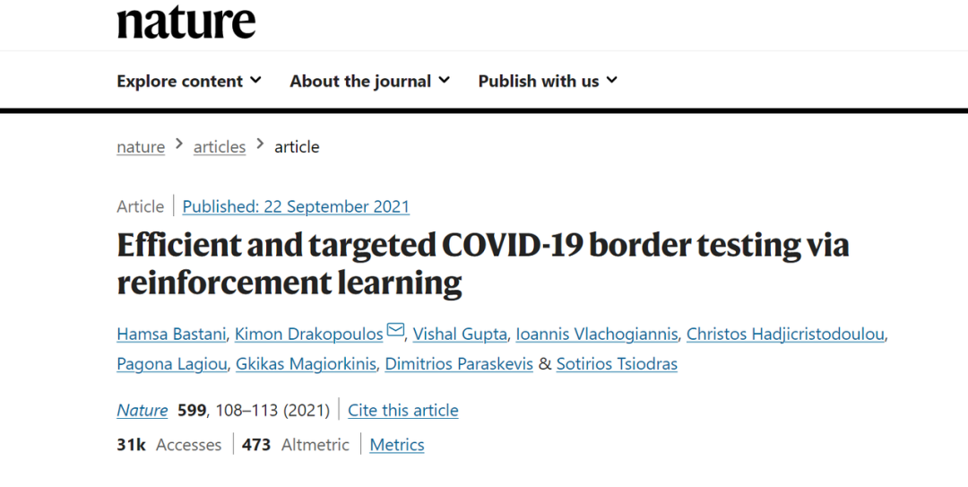 详细介绍 Eva 的论文发布于近日的《自然》杂志。论文标题为 Efficient and targeted COVID-19 border testing via reinforcement learning。