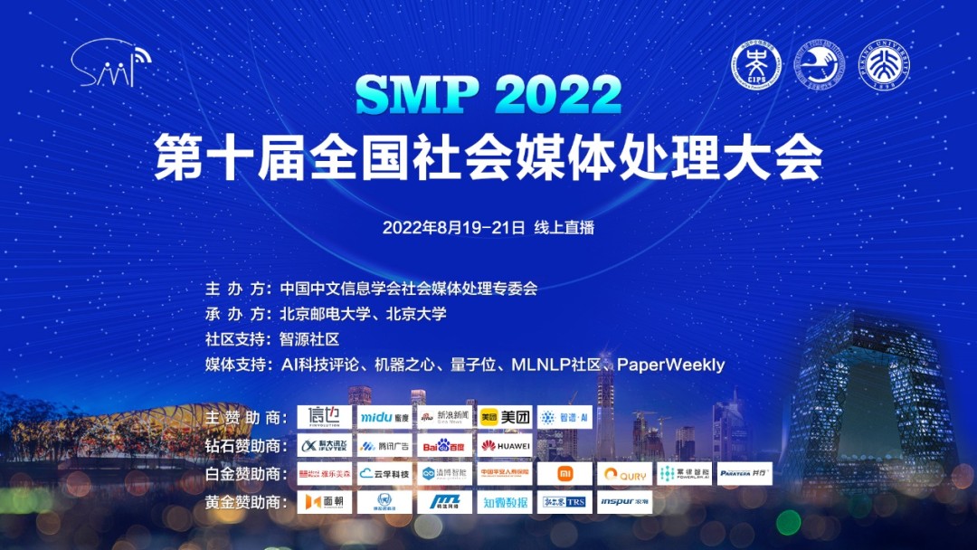 第十届全国社会媒体处理大会(SMP 2022)由中国中文信息学会社会媒体处理专委会主办,北京邮电大学和北京大学承办,将于2022年8月19-21日线上召开,智源社区提供在线支持。感谢以下媒体对本次会议的大力支持:AI科技评论、机器之心、量子位、MLNLP社区、PaperWeekly。