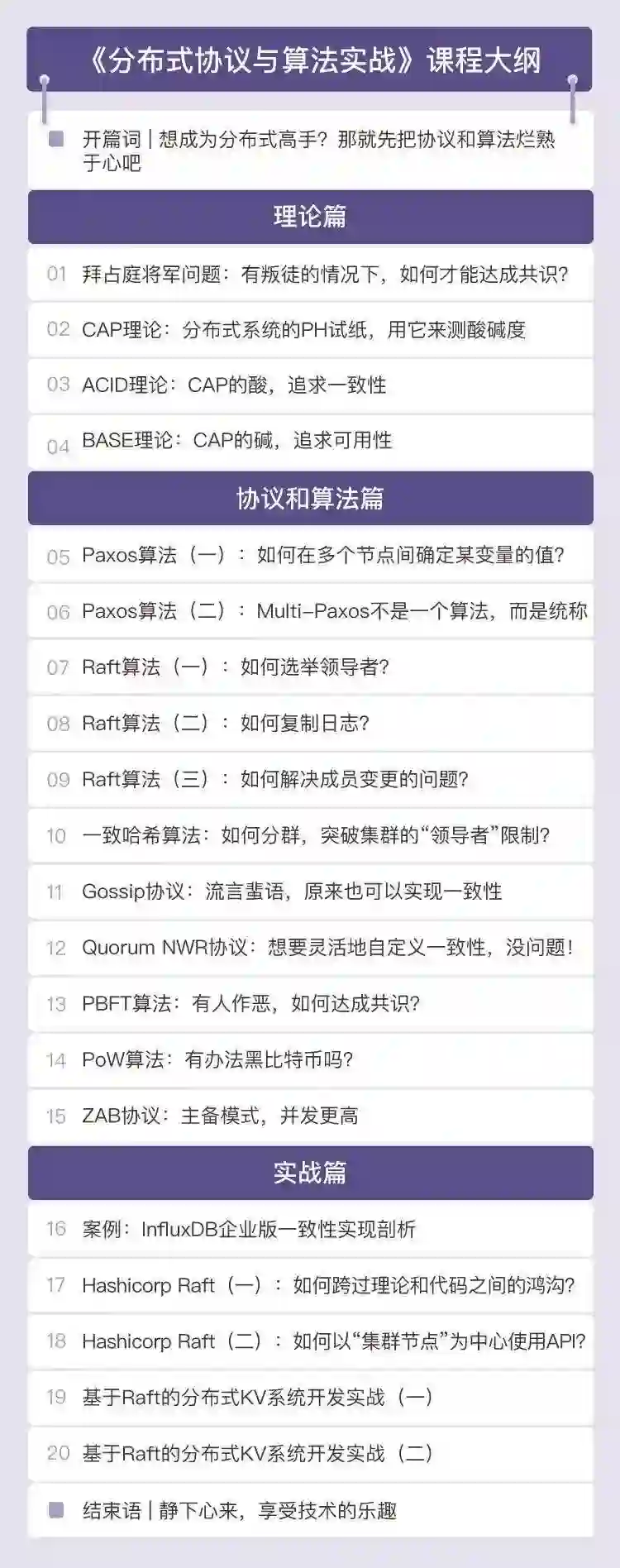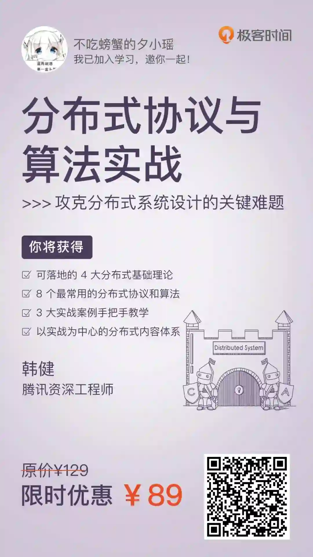 为了帮你彻底拿下分布式技术,理解其中最核心和最为精妙的内容,韩健跟极客时间合作了专栏《分布式协议与算法实战》,力求将自己支撑海量互联网服务中的分布式算法实战心得全部分享给你,让你真正拿下这场攻坚战。