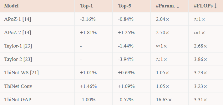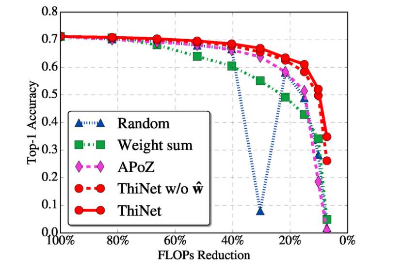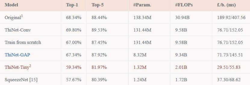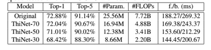 除此之外,在 ResNet-50 上的类似实验证明,即便是对于紧凑的网络,ThiNet 也能减少超过一半的的参数与 FLOPs,而 top-5 准确度仅降低 1%。
