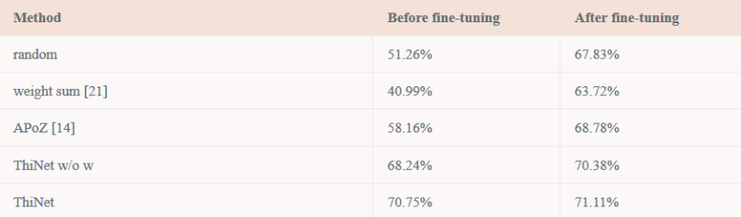 在这之后的微调步骤对于恢复模型的精准度也相当重要,从实验数据可以看出 ThiNet 具有相当的鲁棒性能。