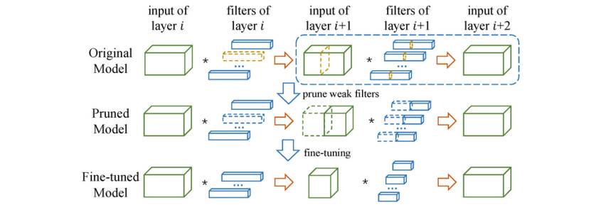 在下图的 ThiNet 剪枝框架图中,先根据图中的虚线框部分判断哪些通道及其相对应的滤波器性能较弱(第一行中用黄色高亮的部分)或可以被其他通道代替。然后丢弃对网络的性能影响较小的通道及其对应的滤波器从而得到一个剪枝模型。之后再对剪枝后的模型进行微调以恢复其精度。