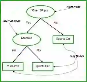 图3中的决策树根据年龄和婚姻状况分类是否购买跑车或小型货车。如果这个人30多年没有结婚,我们可以如下预测:“30多年? - >是 - >'已婚? - >不。因此,该模型输出一个跑车。