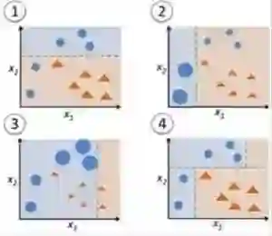 在图9中,步骤1,2,3涉及一个称为决策残缺的弱学习者(一个1级决策树,仅基于1个输入特征的值进行预测)。步骤4结合了以前模型的3个决策树(在决策树中有3个分裂规则)。