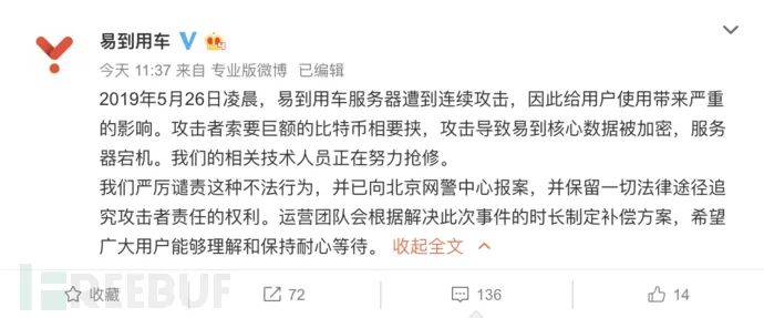 5月26日中午,易到用车微博发布消息称,服务器连续遭到攻击,导致核心数据被加密、服务器宕机,攻击者还要求支付巨额比特币,截止笔者发稿之时易到官网、手机APP仍然处于故障中。