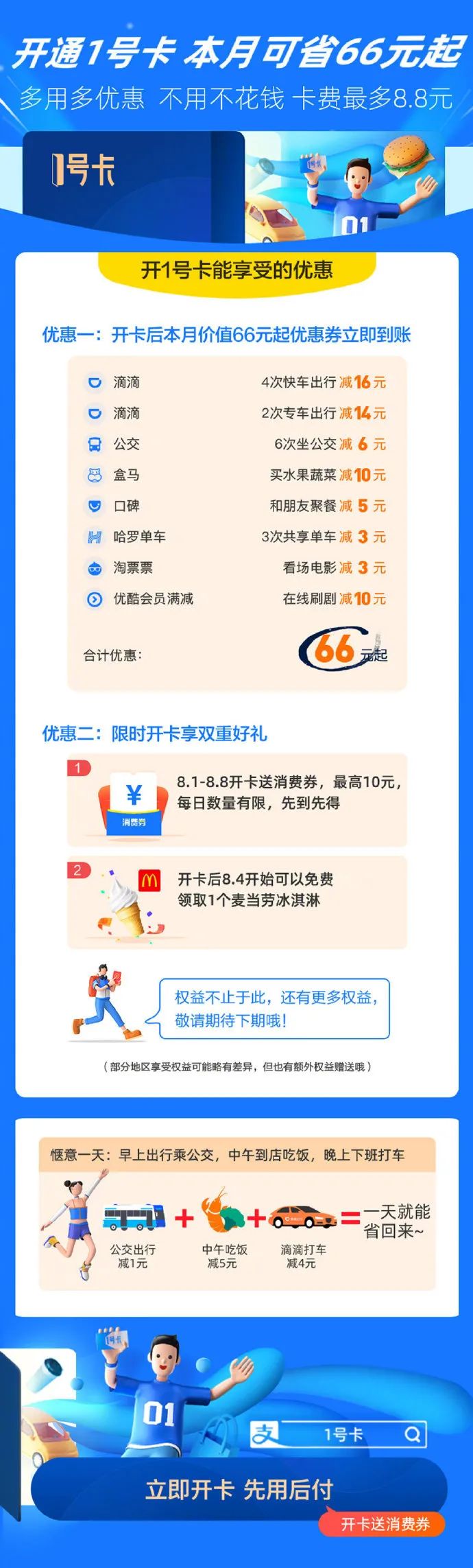 支付宝 1 号卡正式首发:本月可省 66 元起,多用多优惠,不用不花钱。