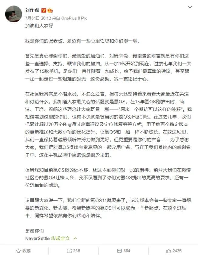 昨晚,一加科技 CEO、一加手机创始人刘作虎在微博表示,全新的氢 OS11 即将到来了,“这次版本会有一些大家一直想要的新变化、新功能”。