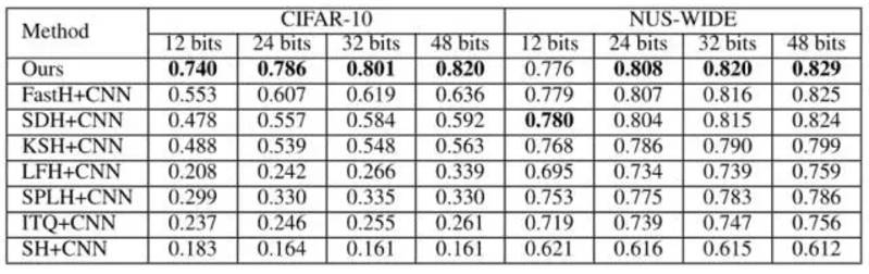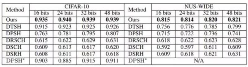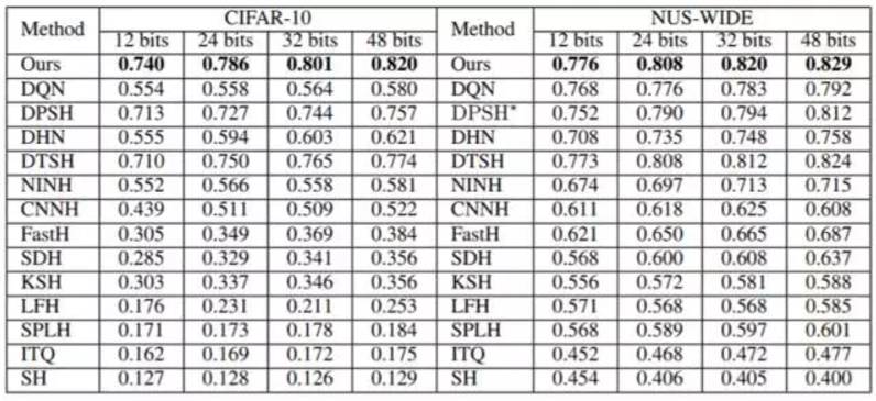 表 1:第一组实验设置下不同方法的 MAP。NUS-WIDE 数据集的 MAP 是根据返回的前 5,000 位邻近值计算的。DPSH * 表示重新运行 DPSH 作者提供的代码。