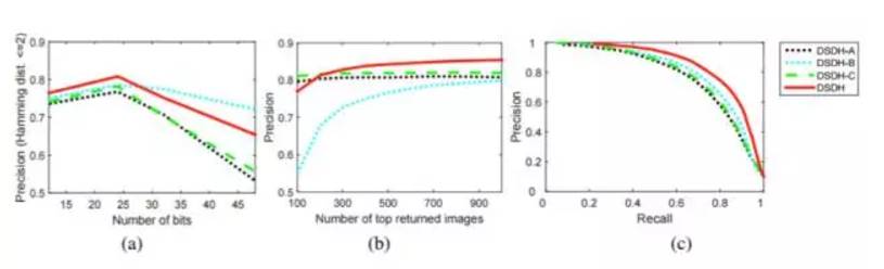 图 1:DSDH-A、DSDH-B、DSDH-C 和 DSDH 在 CIFAR-10 上得到的结果:「a」Hamming 半径为 2 的精度曲线;「b」不同数目最佳返回图像的精度曲线(不确定);「c」具有 48 位哈希编码的精度-召回曲线。