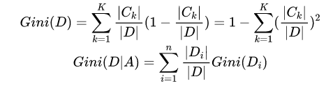 熵模型拥有大量耗时的对数运算,基尼指数在简化模型的同时还保留了熵模型的优点。基尼指数代表了模型的不纯度,基尼系数越小,不纯度越低,特征越好。这和信息增益(率)正好相反。