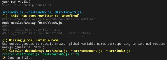 同样,以前在发布 @tarojs/taro-h5 之前,Taro 也需要执行命令 yarn build,使用 Rollup 对源代码进行打包,输出为 dist/index.js 文件: