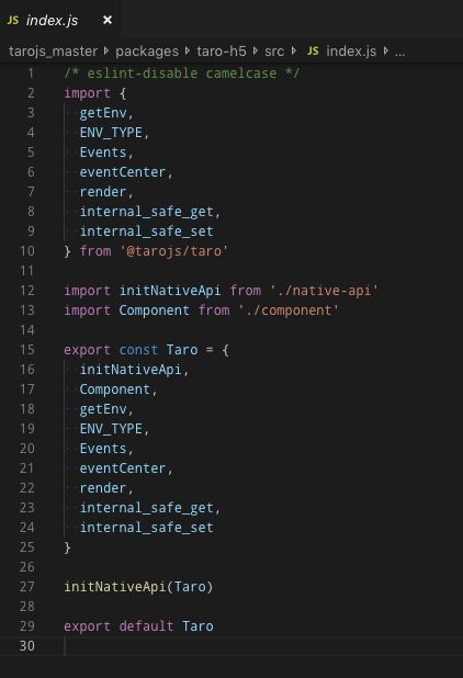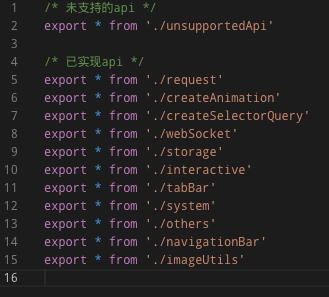粗略一看,@tarojs/taro-h5 还挺 “ESM” 的,但这还不够。我们还需要将这些 Api 以 namedExports 的形式导出,开发者使用 import { XXX } from '@tarojs/taro-h5'导入 Api 即可。
