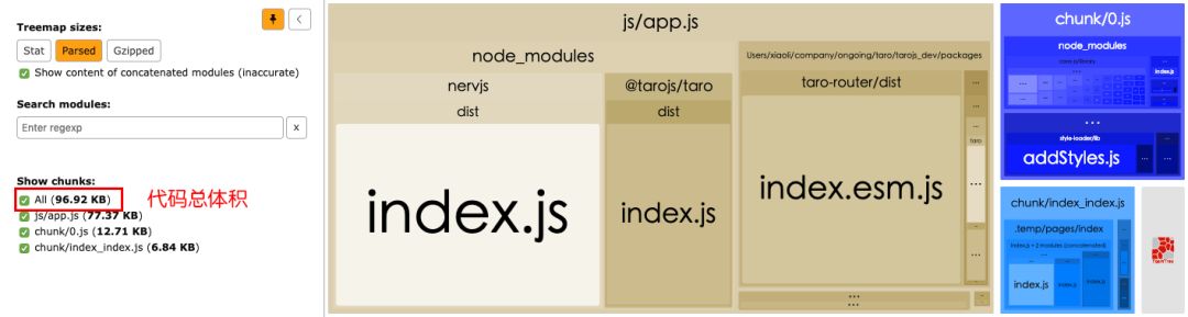这个文件占据了 462KB 的空间,并且由于模块规范等问题,无法进行 treeshaking。所以就算开发者在 Taro 的项目中只引入了两个组件,最终的打包结果也会包含所有的内置组件。