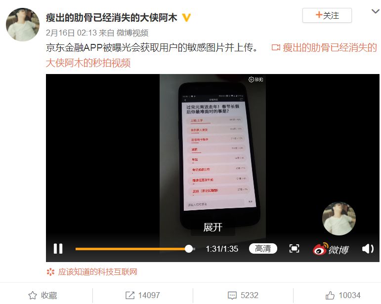 昨天凌晨,该博主在微博上发视频控诉,“京东金融 App 会获取用户的敏感图并上传。”