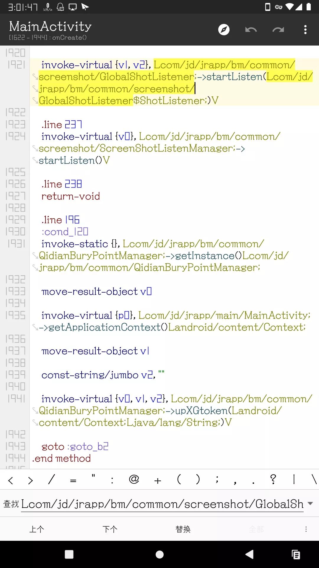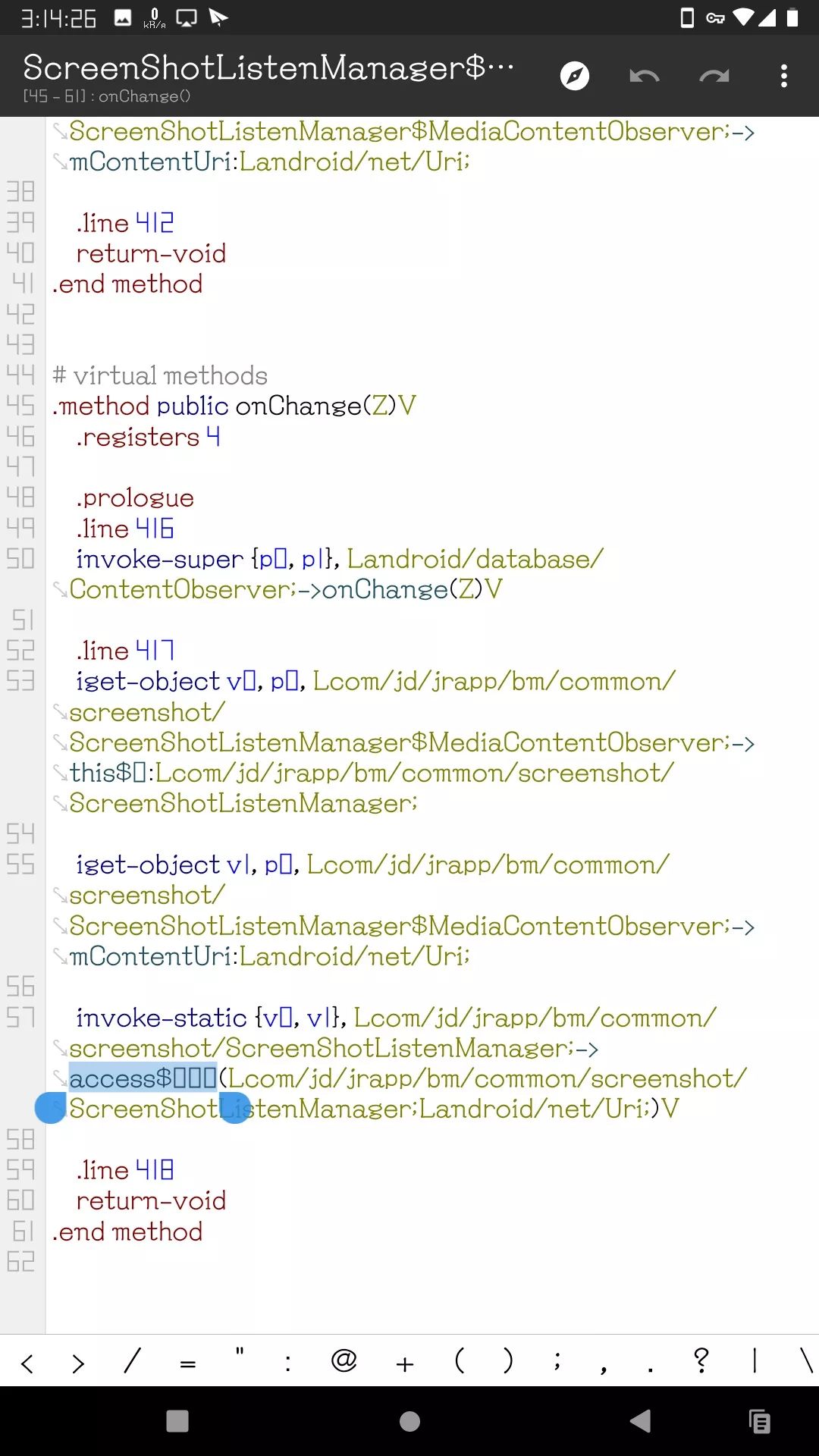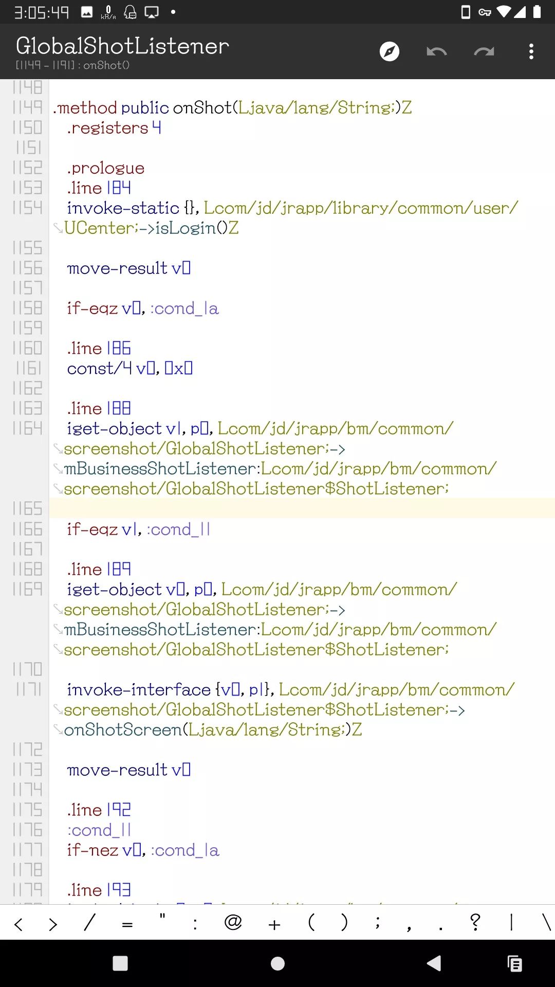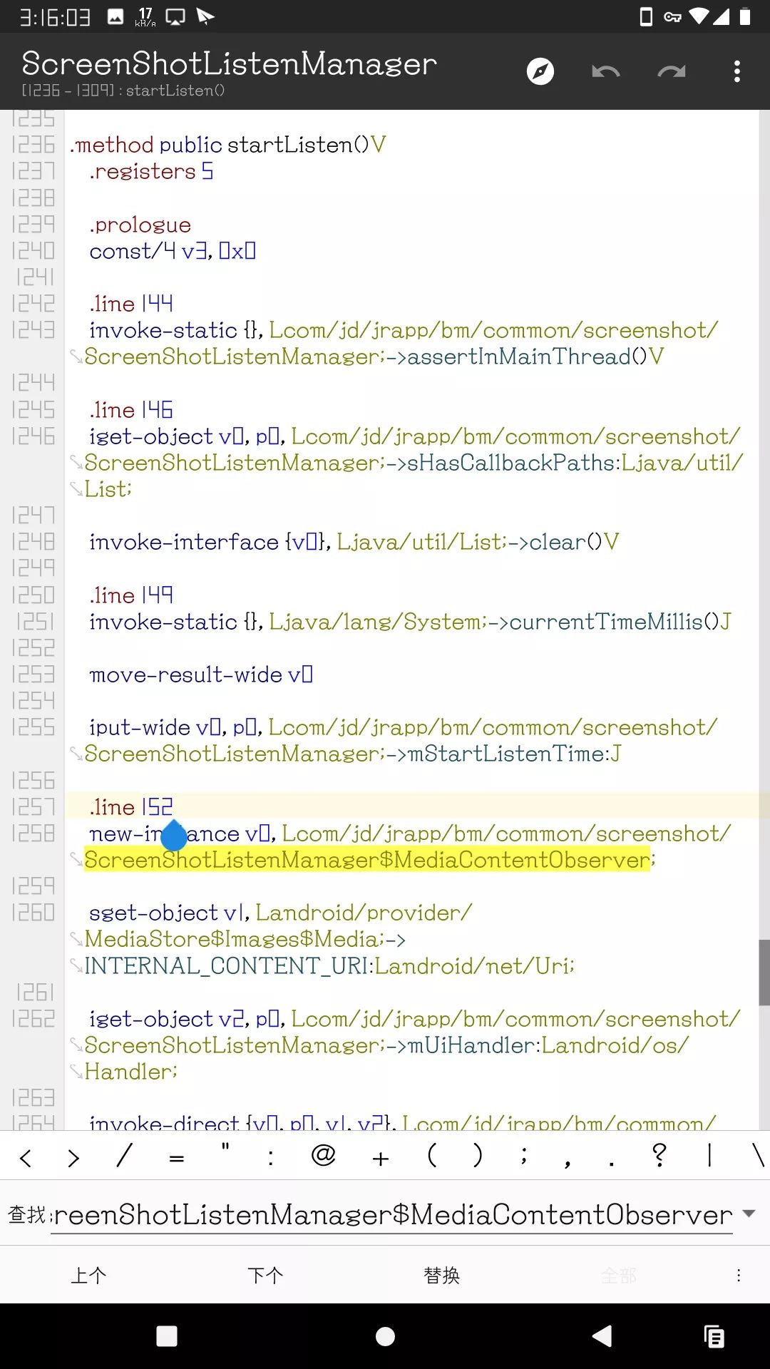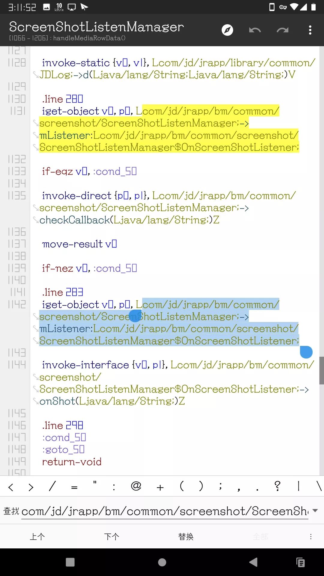 接着爬调用开源库的类并过滤关键词 screenshot 找到了京东金融 App 捕获截图功能代码的这个位置:Lcom/jd/jrapp/bm/common/screenshot/