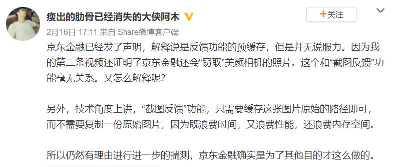 紧接着在 20 分钟后,@瘦出的肋骨已经消失的大侠阿木 再次发微博视频表示,“京东金融 App 不止偷截图,还会偷照片”。在此次视频演示中,他同样先打开了京东金融 App,随后打开美颜相机,并使用美颜相机拍摄一张照片保存,如其预料的一样,在上述京东金融 App 的缓存目录下也找到了刚刚摄下照片。