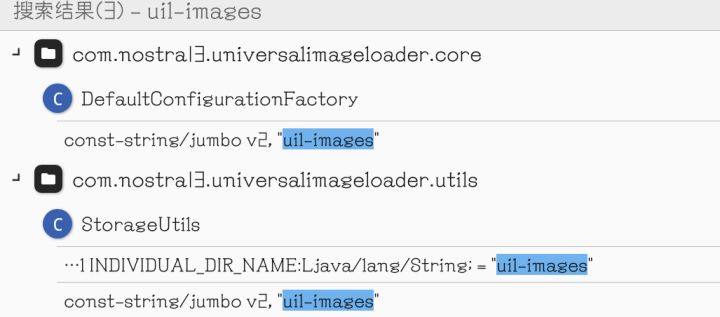 根据微博网友@瘦出的肋骨已经消失的大侠阿木 爆料的视频中,我们可以看到一个名为 uil-images 的文件夹,接下来,直接进 dex 挖字符串: