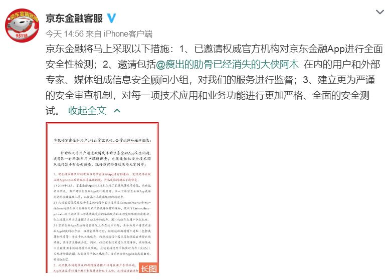 对此,就在刚刚,京东金融再次发微博表示,Android 系统上京东金融 App 5.0.5 之后的版本存在上述问题,当前已下线修复。此外会于下周一即明天邀请权威官方机构对京东金融 App 进行全面安全性检测,邀请包括@瘦出的肋骨已经消失的大侠阿木 在内的用户和外部专家、媒体组成信息安全顾问小组,对其服务进行监督。