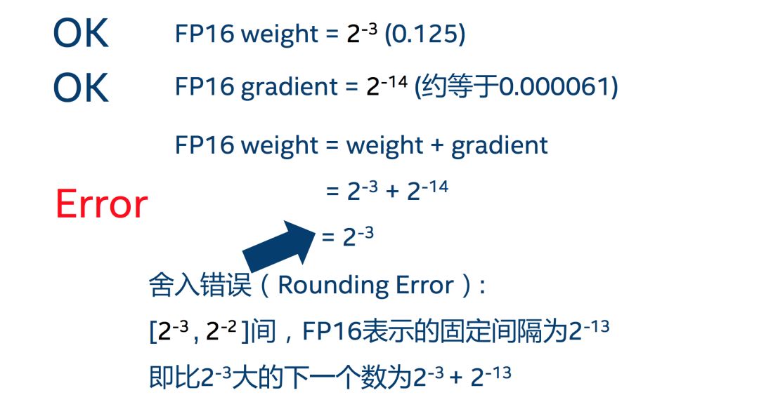 舍入误差(Rounding Error)舍入误差指的是当梯度过小,小于当前区间内的最小间隔时,该次梯度更新可能会失败,用一张图清晰地表示: