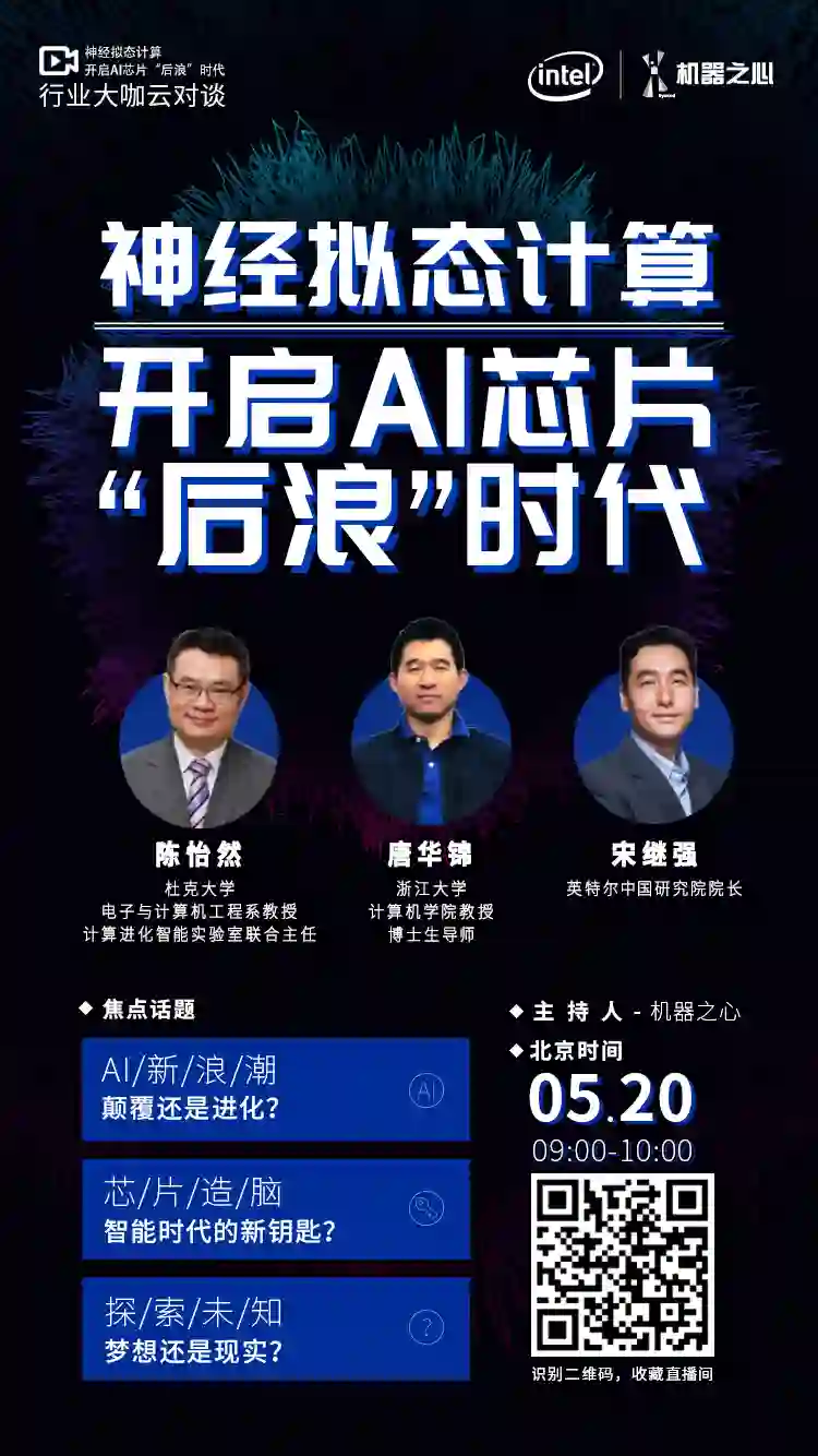 针对这些业界关注的热点问题,机器之心邀请到了杜克大学电子与计算机工程系教授、计算进化智能实验室联合主任陈怡然,浙江大学计算机学院教授、博士生导师唐华锦,英特尔中国研究院院长宋继强,三位重磅嘉宾,讨论神经拟态计算的未来,共话 AI 芯片“后浪”时代。