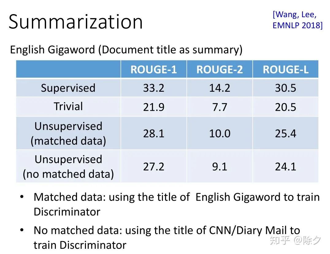 该方法在 Gigaword 数据集上可以看到,无监督的方式略逊于有监督的摘要生成方式。Trivial 的做法是直接把新闻的前几句抽出来作为摘要。它的效果也不差。即便我们不用Gigaword语料去训练无监督模型,而是用 CNN/Diary Mail 的标题数据去训练判别器,它也可以做得很好。ROUGE-1评估有多少unigram是一样的,ROUGE则评估有多少Bigram是一样的。L就是 LCS,最长公共子序列。ROUGE-1分数和人类的感知是最像的。