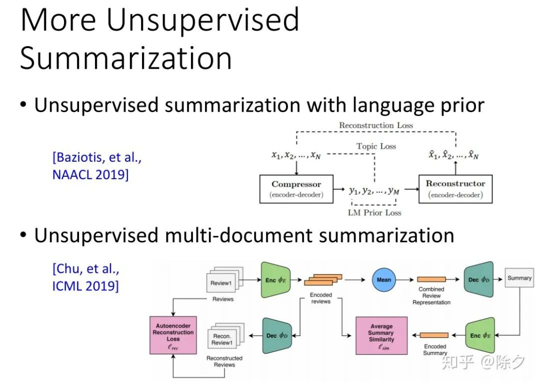• [Chu, et al., ICML’19] Eric Chu, Peter Liu, “MeanSum: A Neural Model for Unsupervised Multi-Document Abstractive Summarization”, ICML, 2019