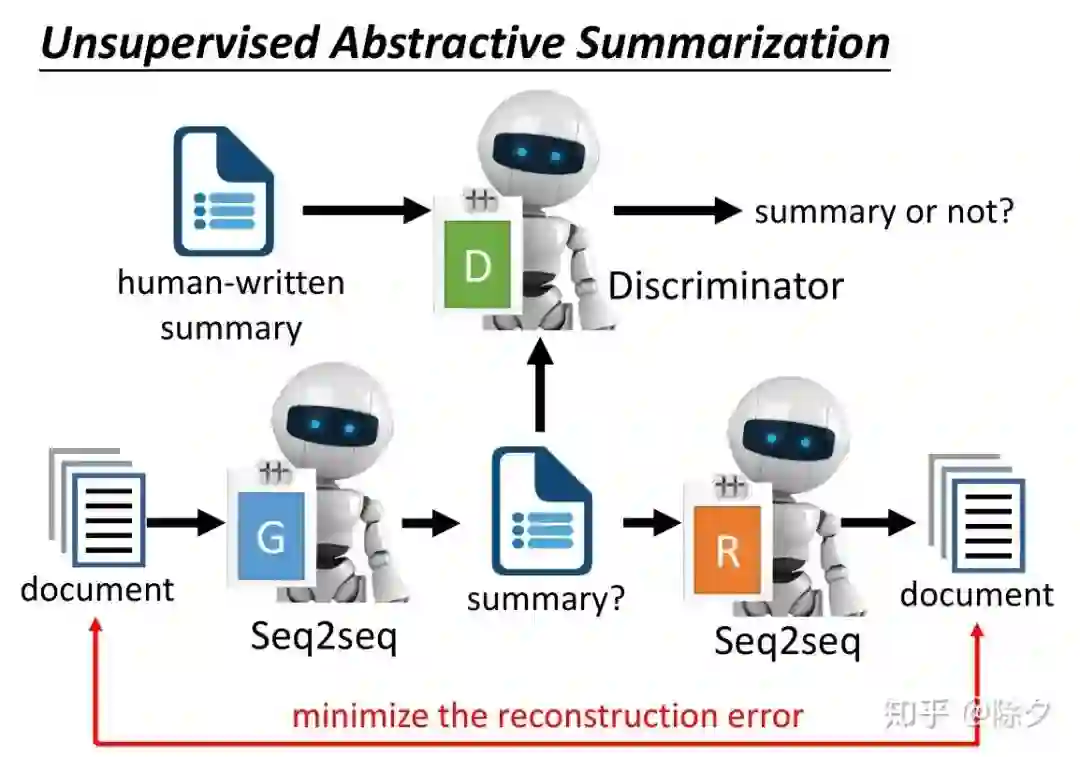 但如果我们套用文本风格迁移 CycleGAN 的做法,就无需对数据有那么大依赖。生成器G是一个序列到序列的模型,输入是一篇文章,输出是其摘要。重构器R则要把生成器G生成的摘要还原成原文档。判别器D则用来判断生成器G生成的摘要和人类手写的摘要,哪个更真实。