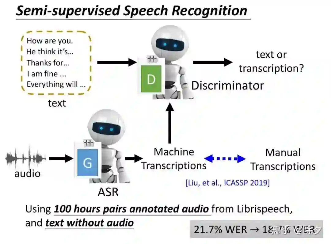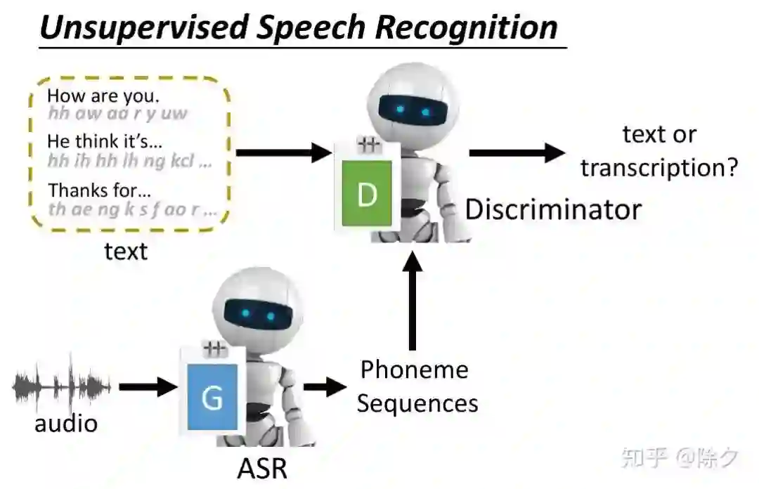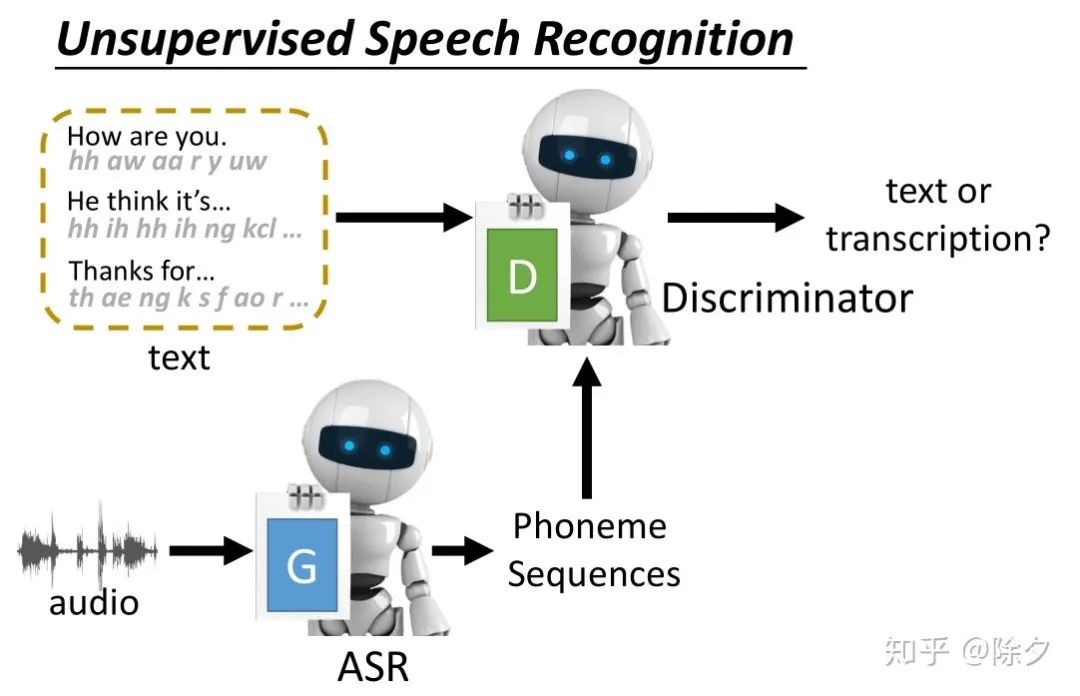 文本风格迁移甚至可以做无监督的语音识别。生成器G的输入是一段声音,输出是这段声音的语音识别文字结果。而判别器需要去判断它像不像是人说的句子。