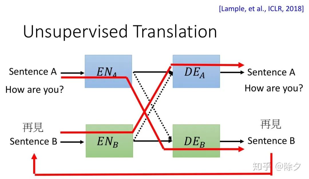 上面这种方式不能保证语言A编码器输出到语言B解码出的句子B,在语义上与输入句子A对应。它有可能出现 How are you 对应到 再见的翻译。所以我们需要借助另外一个无监督学习的翻译模型。这个模型不一定要表现很好,但至少能保证源语言句子到目标语言句子的翻译在语义上不会差的太离谱。这个翻译模型可以只用词到词的无监督翻译模型得到。训练时,就可以反复迭代进行。