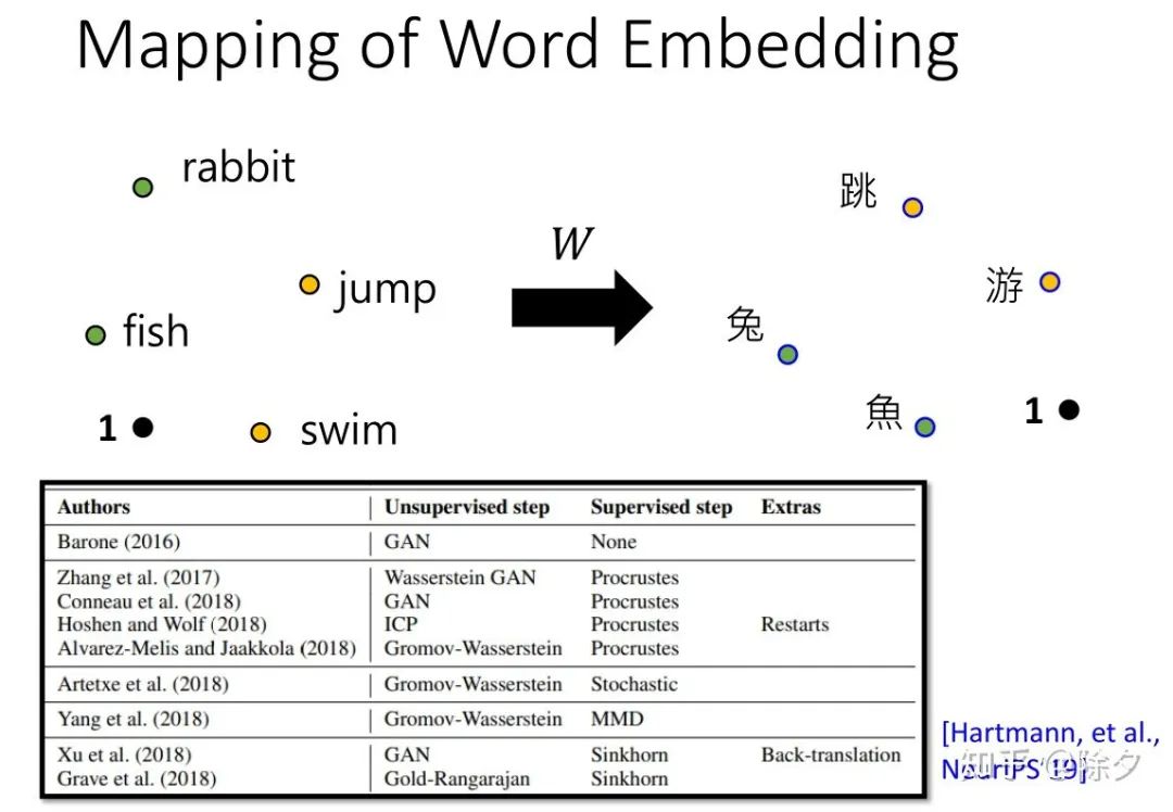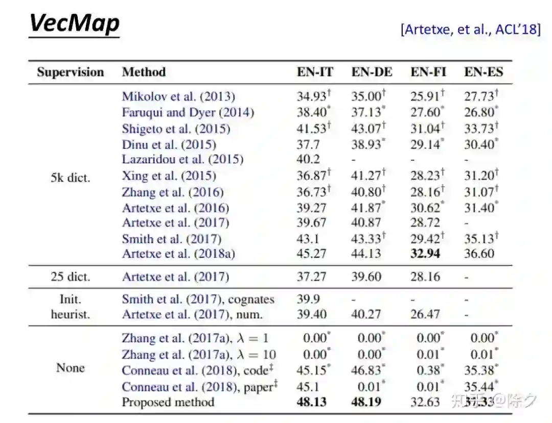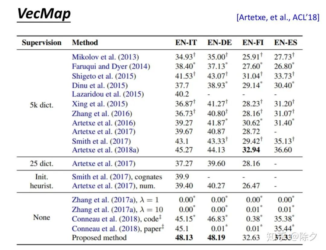但今天也有很大的突破。ACL 18 有个叫 VecMap 的方法。过去的基于有监督的方法需要用到5k的中英文词汇映射字典。但当下无监督的方法,可以做到不用词典比有监督的方法还好。