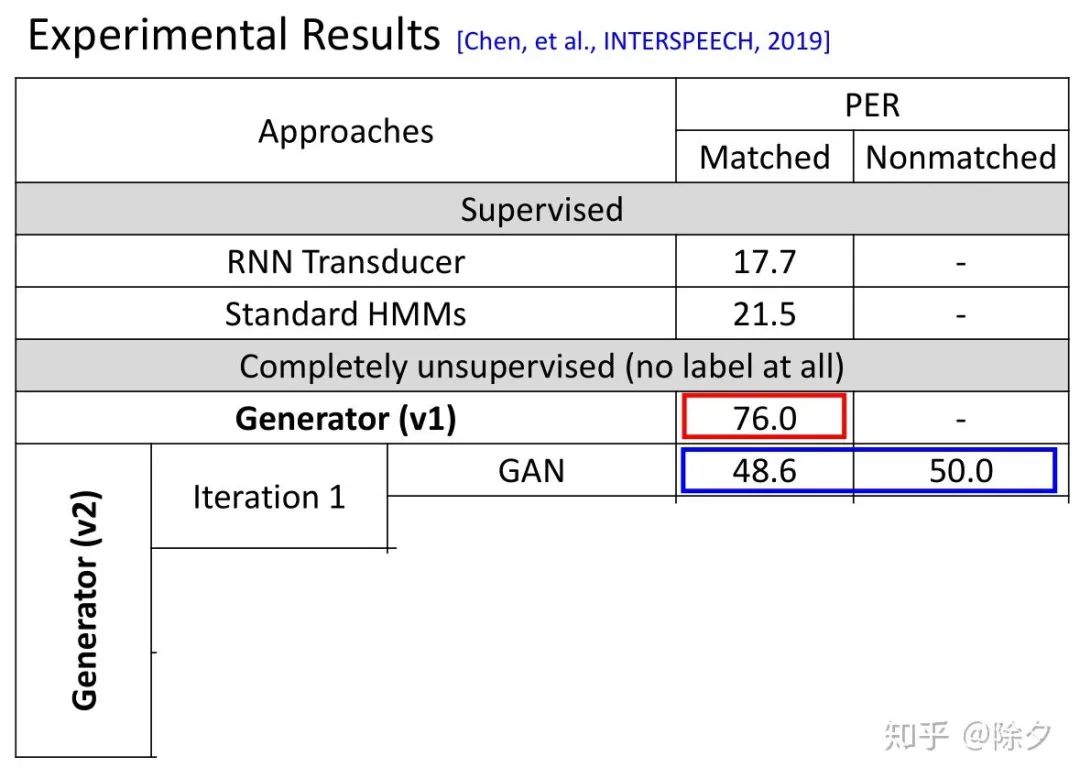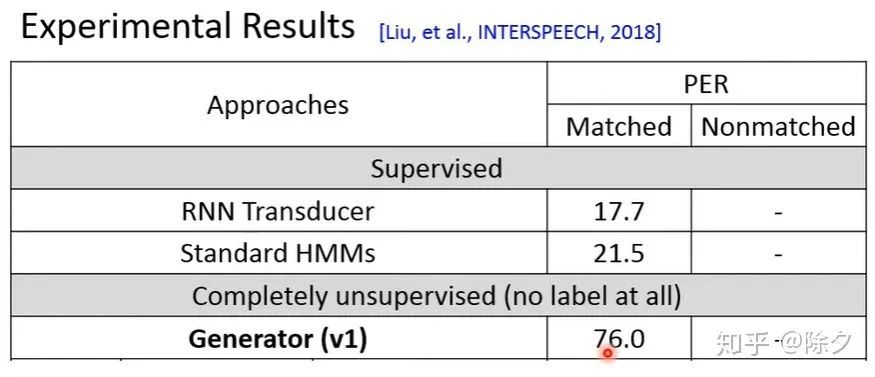 指标是用 PER,越低越好。有监督的 RNN 模型,大概在 17.7 左右。但对于完全无配对标注数据的无监督模型而言。PER 差得惨不忍睹。虽然很烂,但可以看出它是有学到一些东西的。